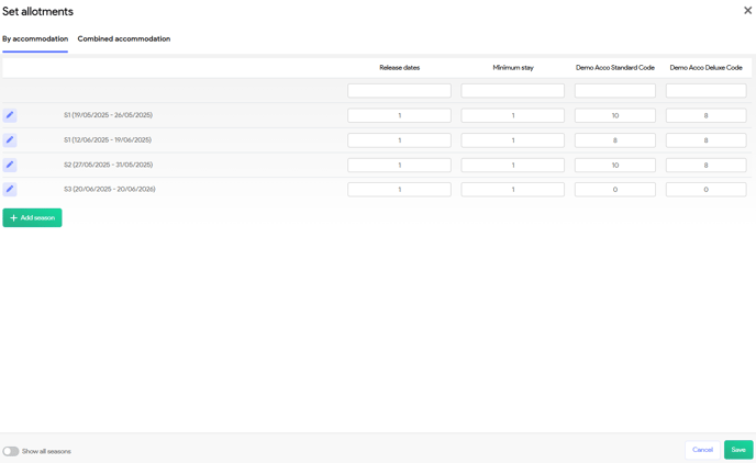 - Column 3 - #: these columns will be the accommodations you have defined on the accommodation tab. In these columns you can enter the number of allotments you received from the supplier for each corresponding season period.