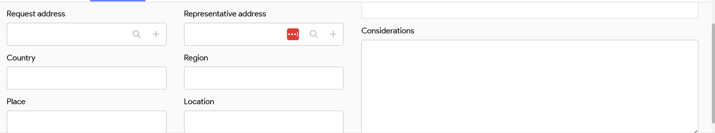 Adress, Billing, Request and rep address (as per Product set up in Product management)