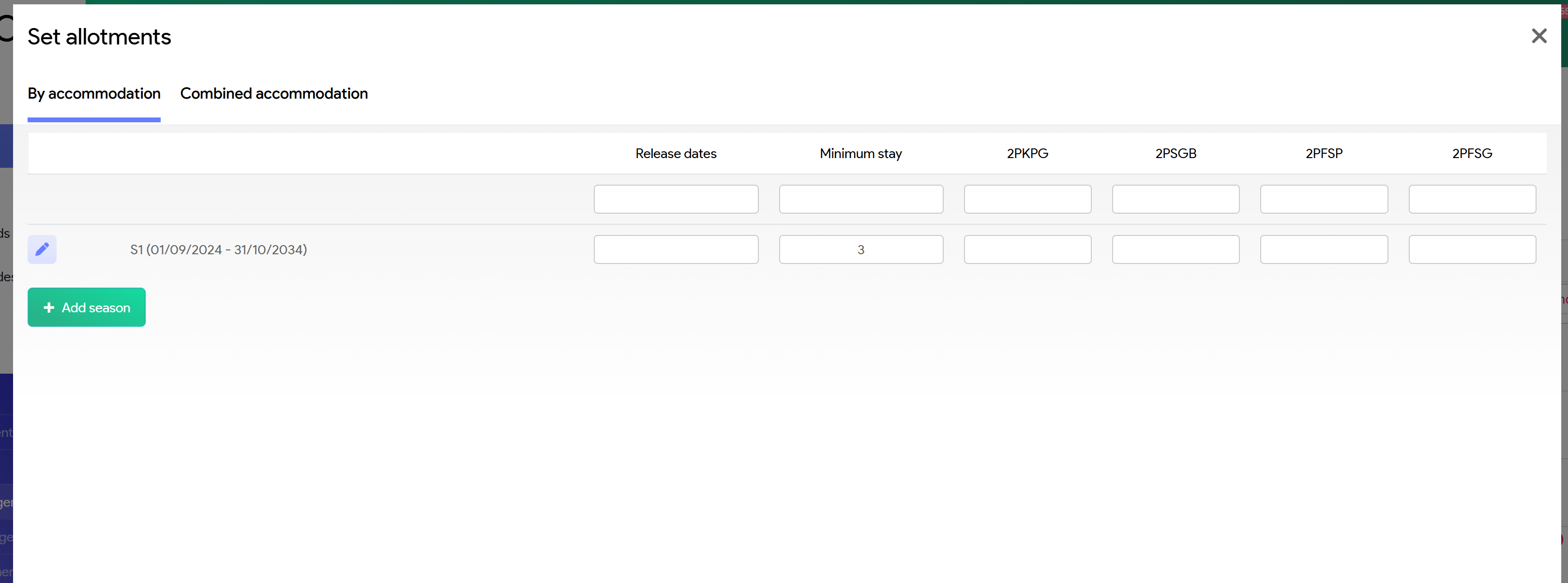 If you have different seasons and all seasons have the same number of rooms available, you can input the number on the top row and system will populate that for each season.