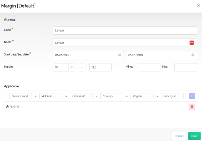 | Code | Internal identifier (e.g. Default Margin, Margin hotels EU, Airport Tax) |