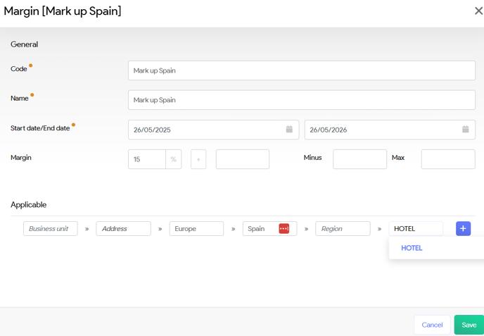 In this example, the system will apply a 10% markup to all service lines, while for Hotel products destined for Spain, a 15% markup will be calculated instead.