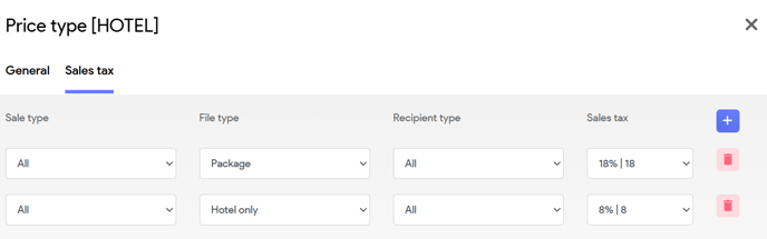 Let's set up a concrete example. We'll set up 2 sales tax configurations for the price type HOTEL.