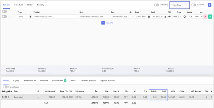 You will see in the booking on each service line, how much VAT on margin (BoM) has been calculated. Please note that indicated in the image below the file type is automatically set to Hotel Only, thus we expect a 8% notional margin, which results in a 1,68% VAT on Margin.