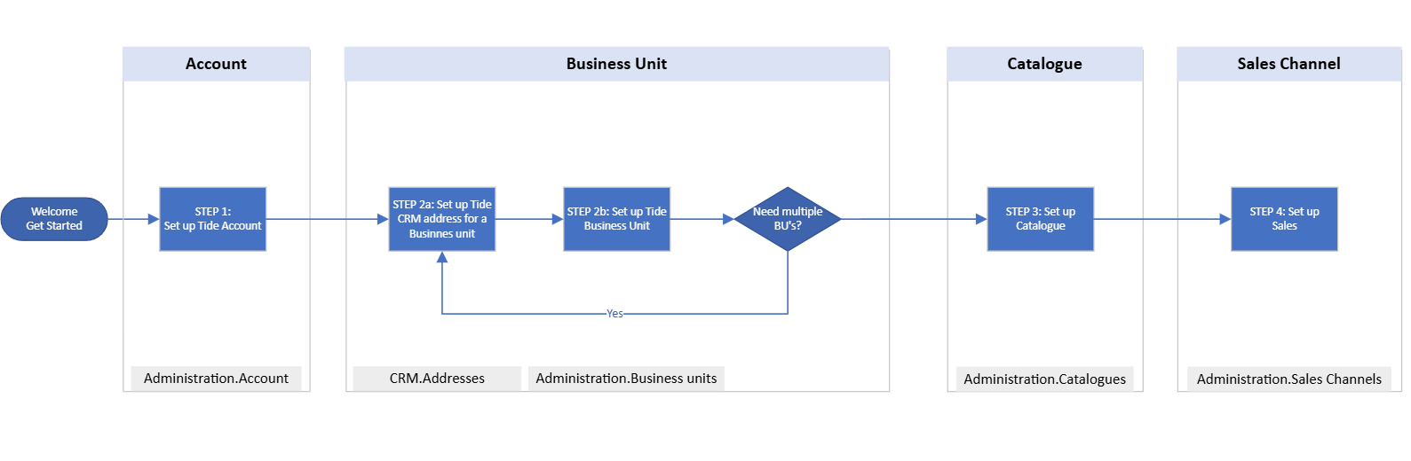 We will begin by organizing your company within the Tide platform. This process involves establishing an Account, creating a Business Unit, configuring a Sales Channel, setting up a Catalogue, and concluding with the setup of user accounts.